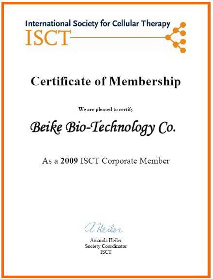 2009In August, Beike Biotechnology obtained the International Cell Therapy Association(International Society for Cellular Therapy, ISCT) membership, and obtained the membership certificate issued by the association and became a formal member of the organization.