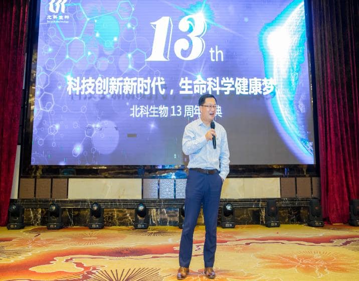 The picture shows Dr. Hu Xiang, chairman of Beike Biotech, delivering a speech to congratulate Beike Biotech on its 13th anniversary