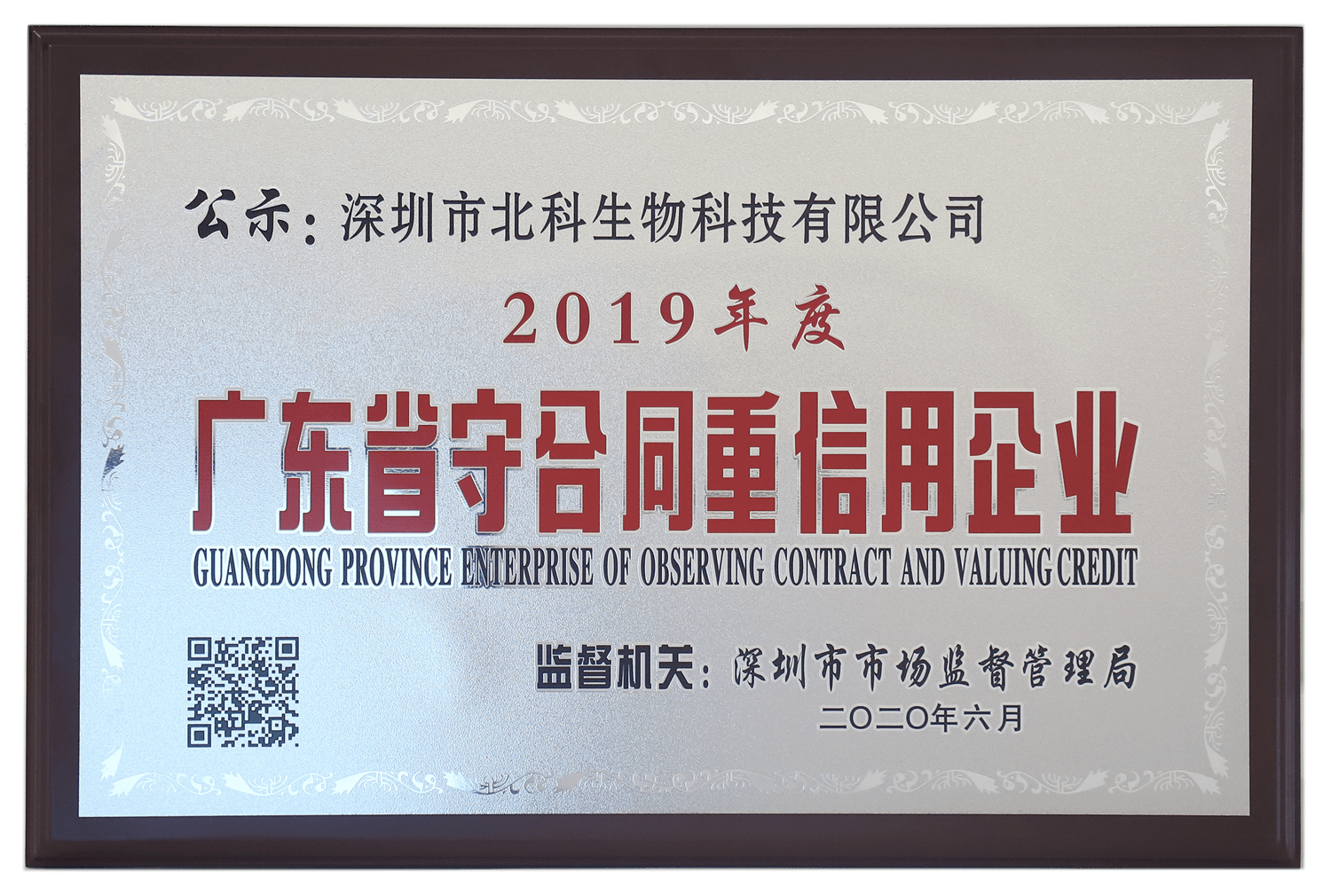 Recently, the Guangdong Provincial Administration for Market Regulation announced the 2019 list of Guangdong Provincial Contract-abiding and Credit-worthy Enterprises. Beike Biotech was awarded the honorary title of “Guangdong Province’s Contract-abiding and Trustworthy Enterprise in 2019” for its outstanding achievements in rigorous and innovative corporate philosophy, honest and trustworthy business principles, and good social reputation.