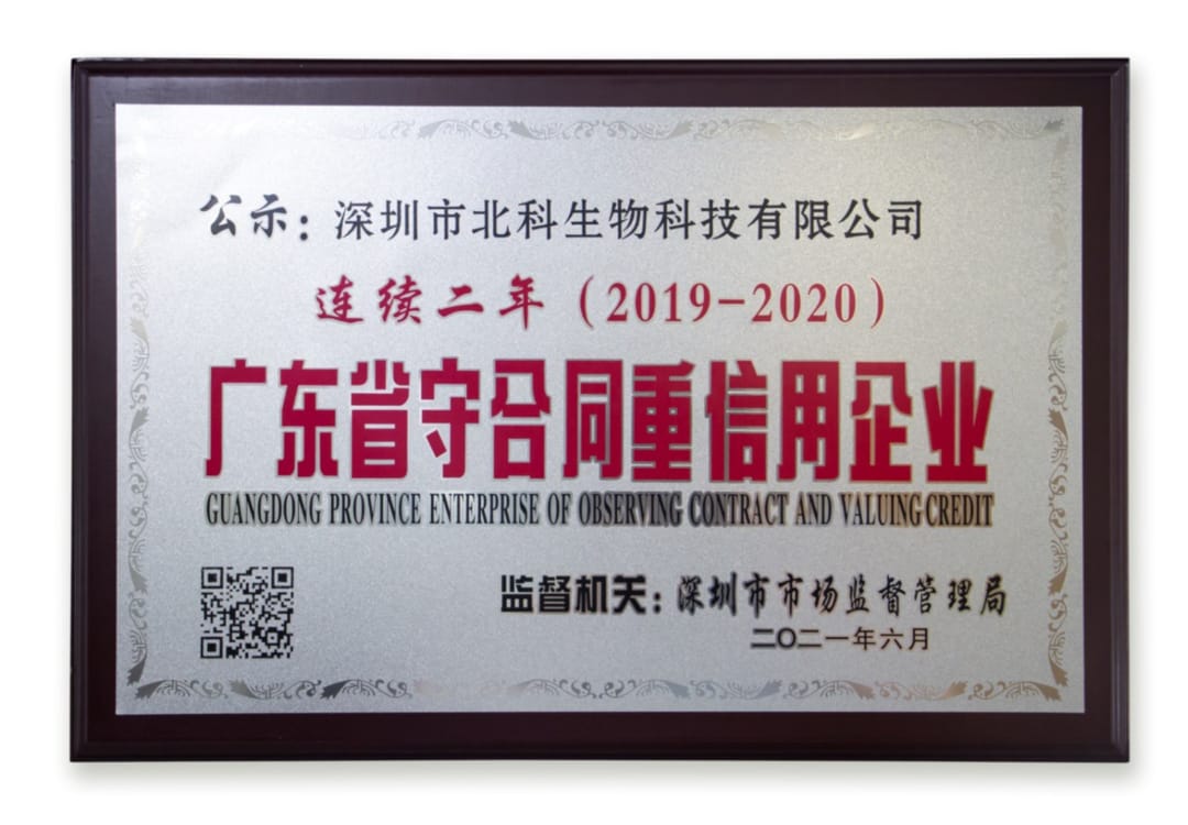 Recently, the Guangdong Provincial Administration for Market Regulation announced the 2020 list of Guangdong Province’s contract-abiding and credit-worthy enterprises. Shenzhen Beike Biotechnology Co., Ltd. successfully passed the final review and won the honorary title of “Guangdong Province’s Contract-abiding and Credit-worthy” for two consecutive years, and was awarded a plaque and certificate of honor.
